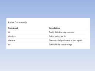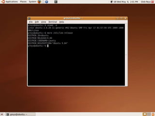 The document provides information about Linux operating system. It discusses the history of Linux, how it was developed by Linus Torvalds as a free and open source alternative to Unix. It describes the key components of Linux like the kernel, types of kernels (microkernel, monolithic, hybrid), features of Linux like portability, open source nature, security etc. It also discusses popular Linux distributions like Ubuntu, Red Hat, Debian, Fedora and SUSE. Finally, it mentions some methods of installing Linux like booting from a USB or burning a live CD.