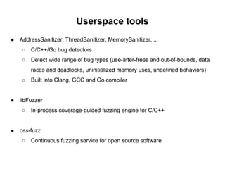 The document discusses methods for finding 0days in the Linux kernel using various tools like AddressSanitizer, libFuzzer, and syzkaller, which help detect a range of bug types through dynamic bug finding techniques. Syzkaller is highlighted as a coverage-guided fuzzer that has found over 400 bugs, including serious vulnerabilities, and the document outlines a step-by-step approach to using it for bug discovery. It also mentions additional fuzzing tools and techniques for enhancing kernel security and bug detection methods.