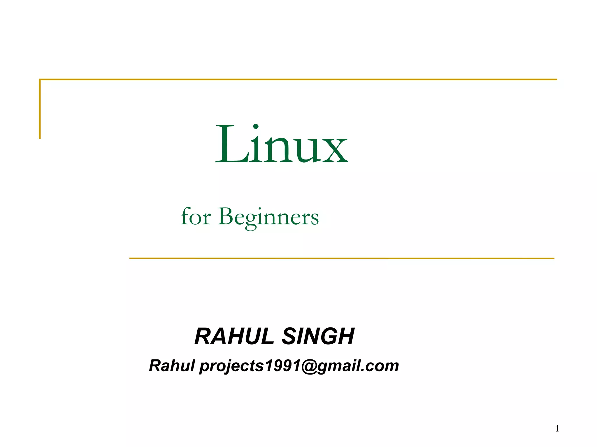 This document provides an overview of Linux for beginners. It introduces Linux distributions, getting started with the command line interface, files and directories, processes, and basic shell scripting. The document is an agenda for a Linux course aimed at complete beginners to introduce fundamental Linux concepts and commands.