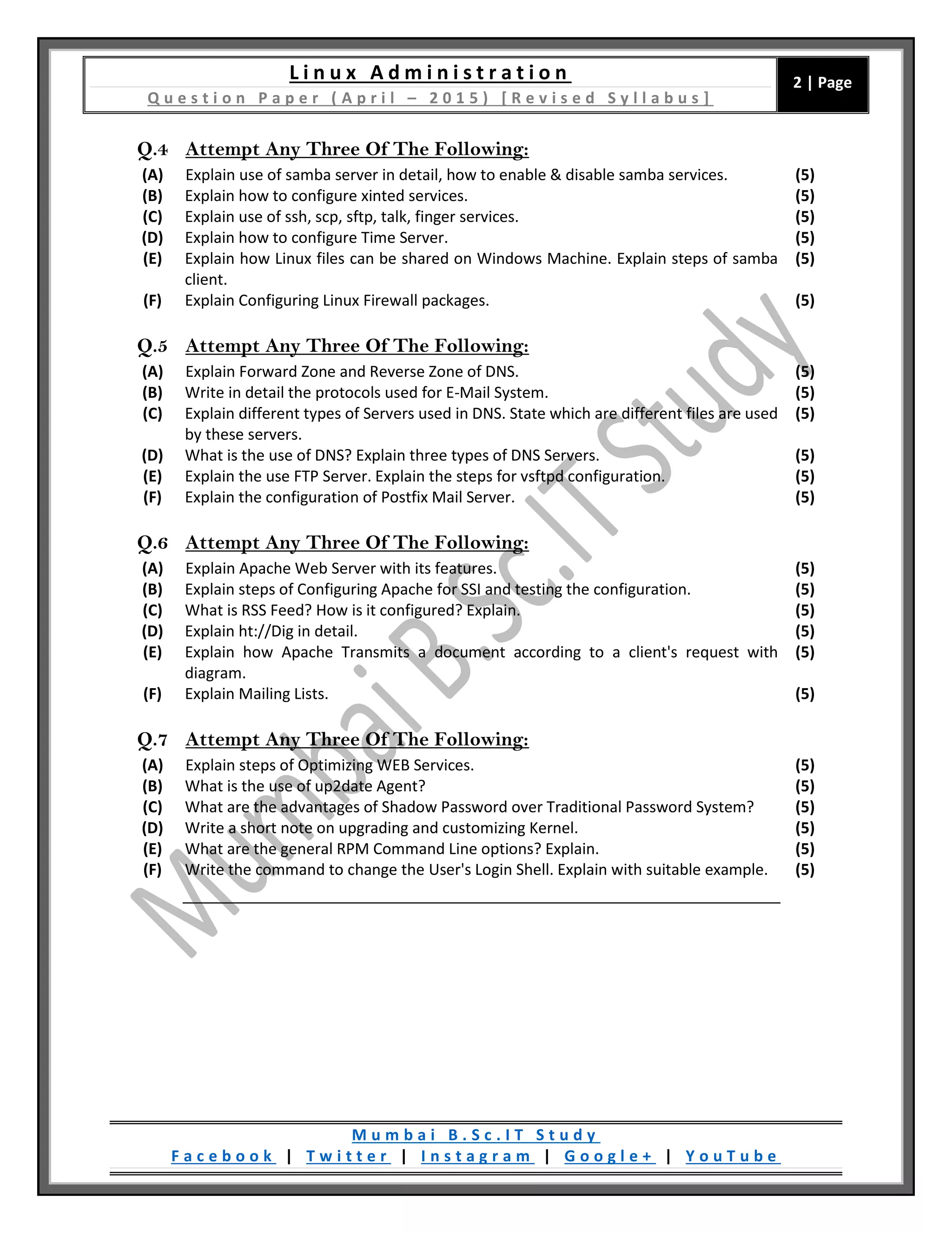 The document is a Linux administration question paper from April 2015, comprising various topics including user account management, server types, and system configurations. Students are required to attempt questions covering multiple aspects of Linux, including file systems, boot loaders, DNS servers, and web services, demonstrating their understanding of Linux administration. Each question has a specified mark allocation, and all answers must be written together with appropriate diagrams where necessary.
