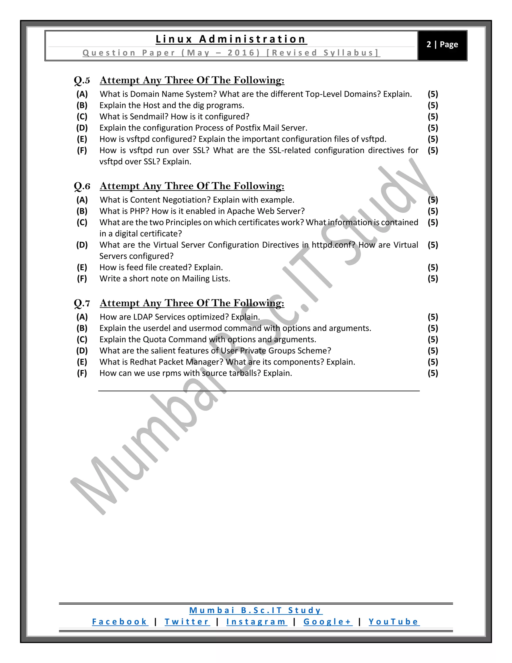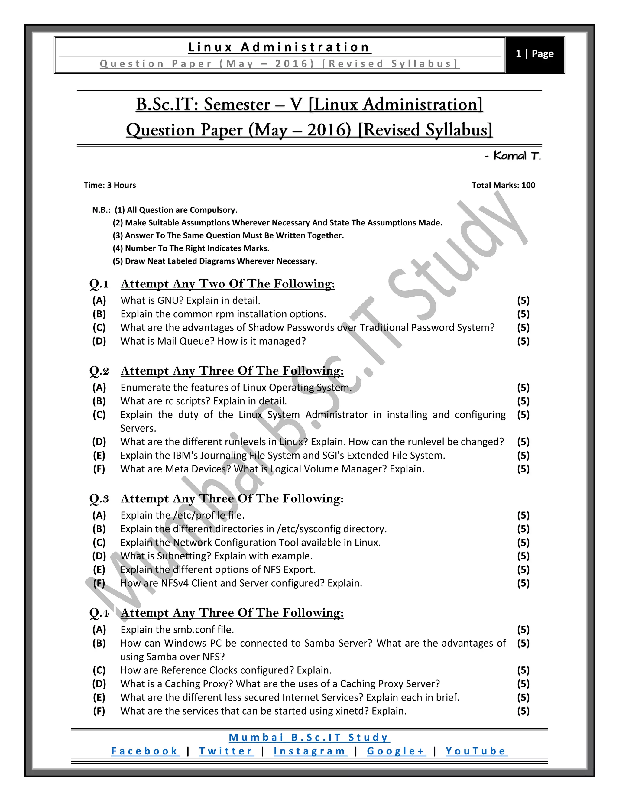 The document is a Linux administration question paper from May 2016, consisting of various questions related to Linux operating system concepts, system administration tasks, and network management. It covers topics such as GNU, RPM installation, mail queues, runlevels, and file systems, with a focus on practical applications and configurations. The paper emphasizes diagram use, suitable assumptions, and consists of several compulsory questions across multiple sections.