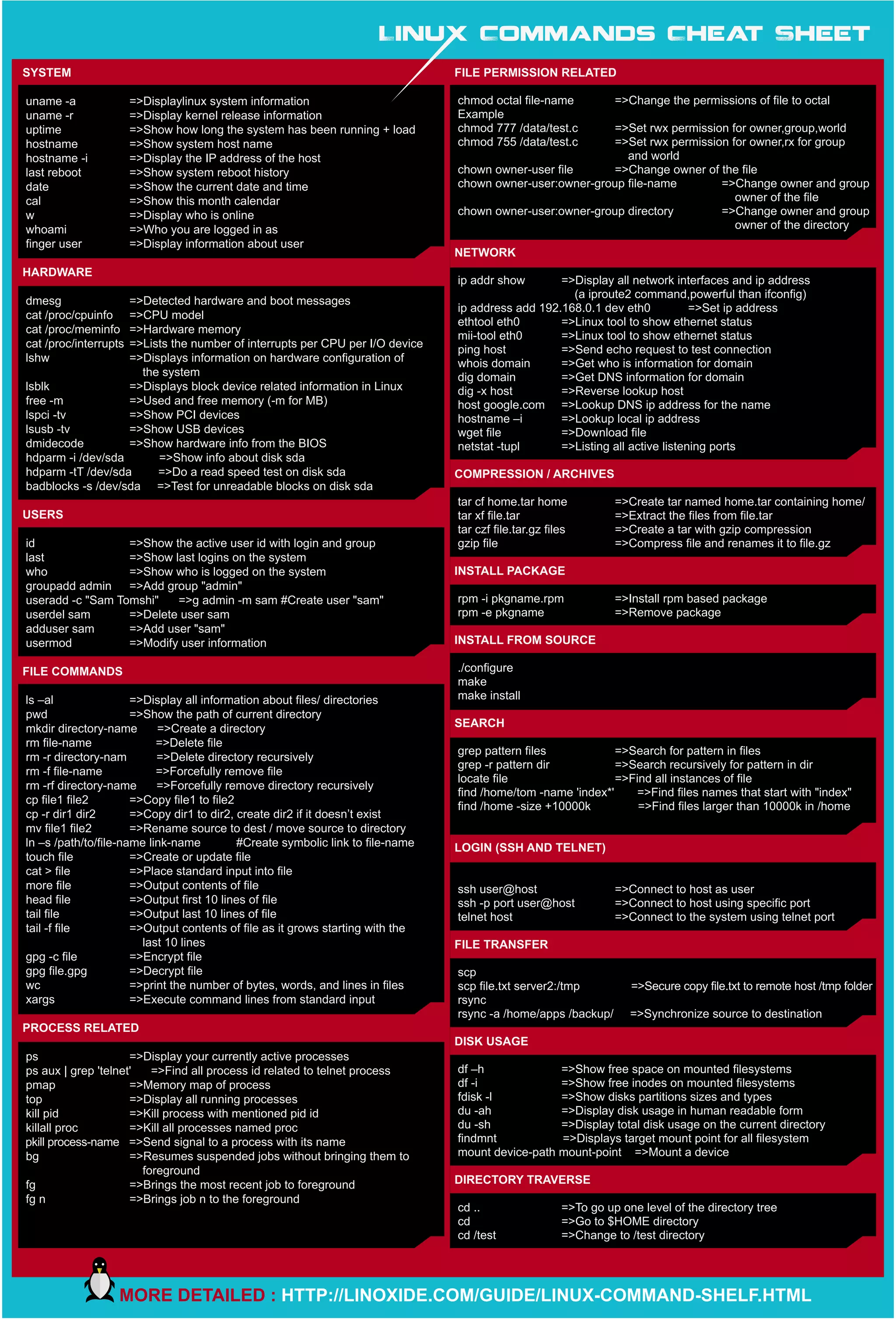 This document provides a summary of common Linux commands organized by category including file permissions, networking, compression/archives, package installation, searching, login, file transfer, disk usage, directory traversal, system information, hardware information, users, file commands, and process related commands. It also includes brief descriptions and examples of commands like chmod, chown, ip, tar, rpm, grep, ssh, df, du, and kill. More detailed information on Linux commands can be found at the provided URL.