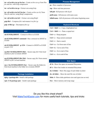 This document provides a summary of common Linux commands organized into categories including file commands, system commands, file searching commands, file encryption and compression, process management, keyboard shortcuts, SSH, disk space, and package installation. It describes the basic functions of commands like ls, cd, grep, tar, find, kill, top, du, and packages management tools. The document aims to uncomplicate Linux commands for newcomers to the command line.