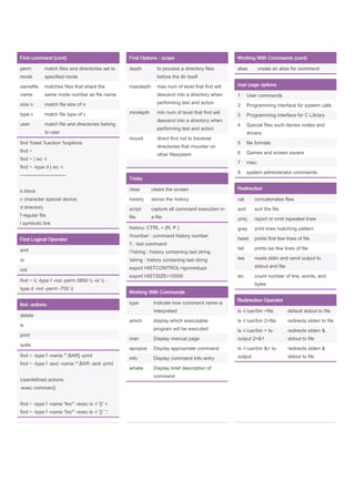 This document provides a summary of Linux command line cheat sheet covering topics such as: