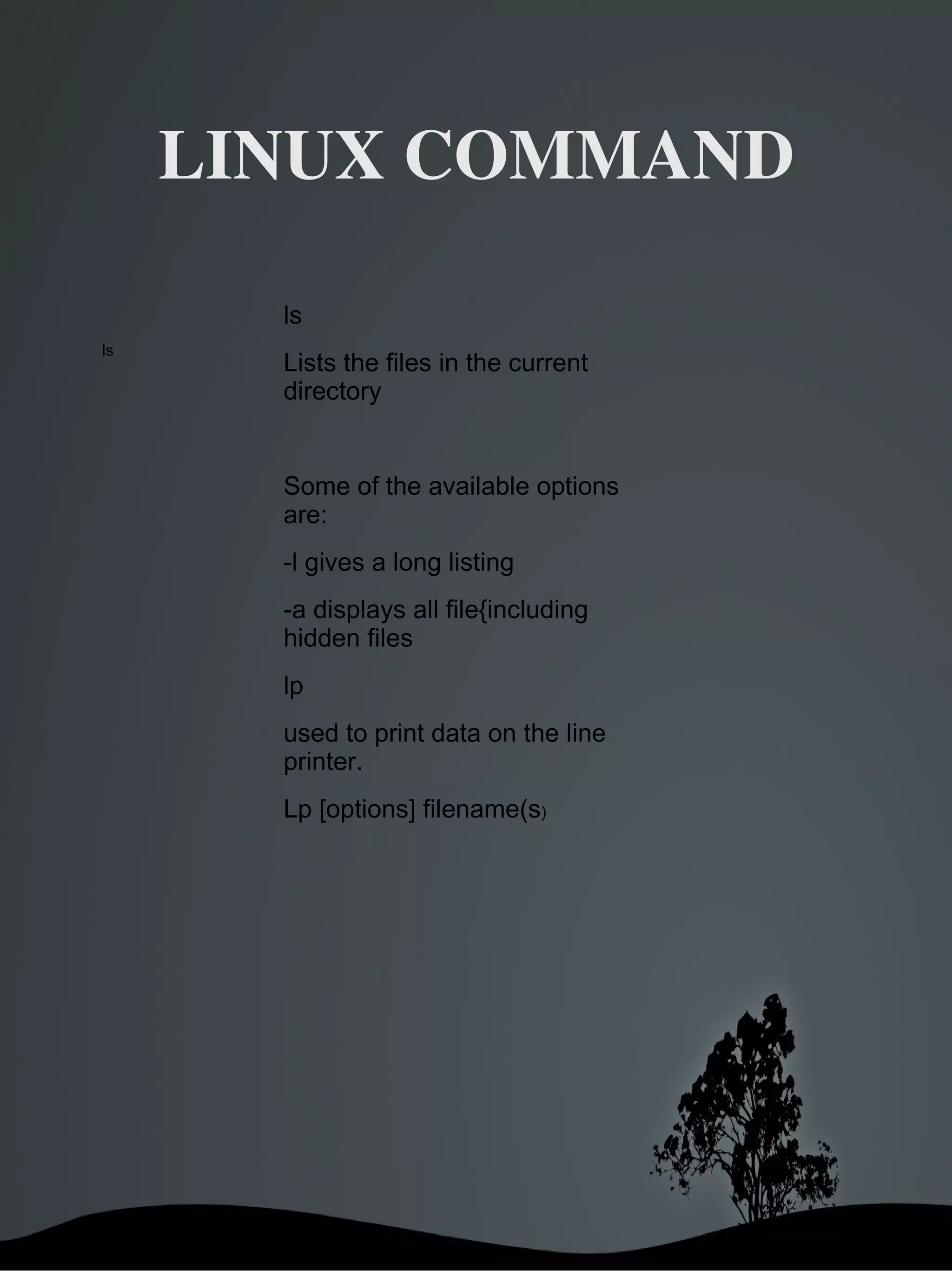 ![LINUX COMMAND ls ls Lists the files in the current directory Some of the available options are: -l gives a long listing -a displays all file{including hidden files lp used to print data on the line printer. Lp [options] filename(s )](https://image.slidesharecdn.com/linuxcommd-100520095650-phpapp01/75/Linux-commd-1-2048.jpg)