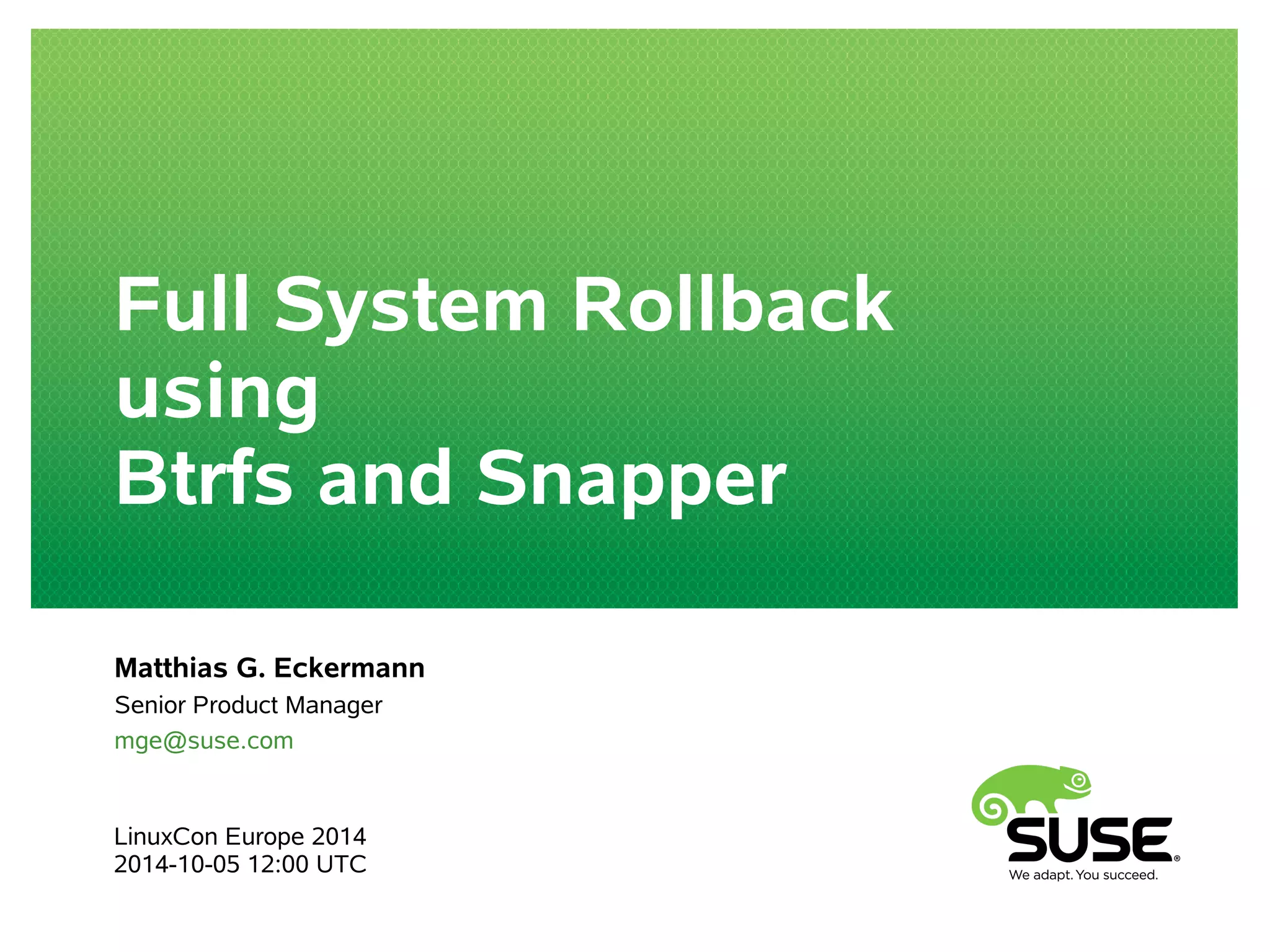 This document discusses using Btrfs and Snapper to enable full system rollbacks in Linux. It describes how snapshots are automatically created to capture the state of the system before changes. Using Snapper, administrators can rollback the entire system to a previous snapshot to undo changes or revert to a known good state. The document provides examples of rolling back packages, kernels and system configuration changes while ensuring system integrity and compliance.