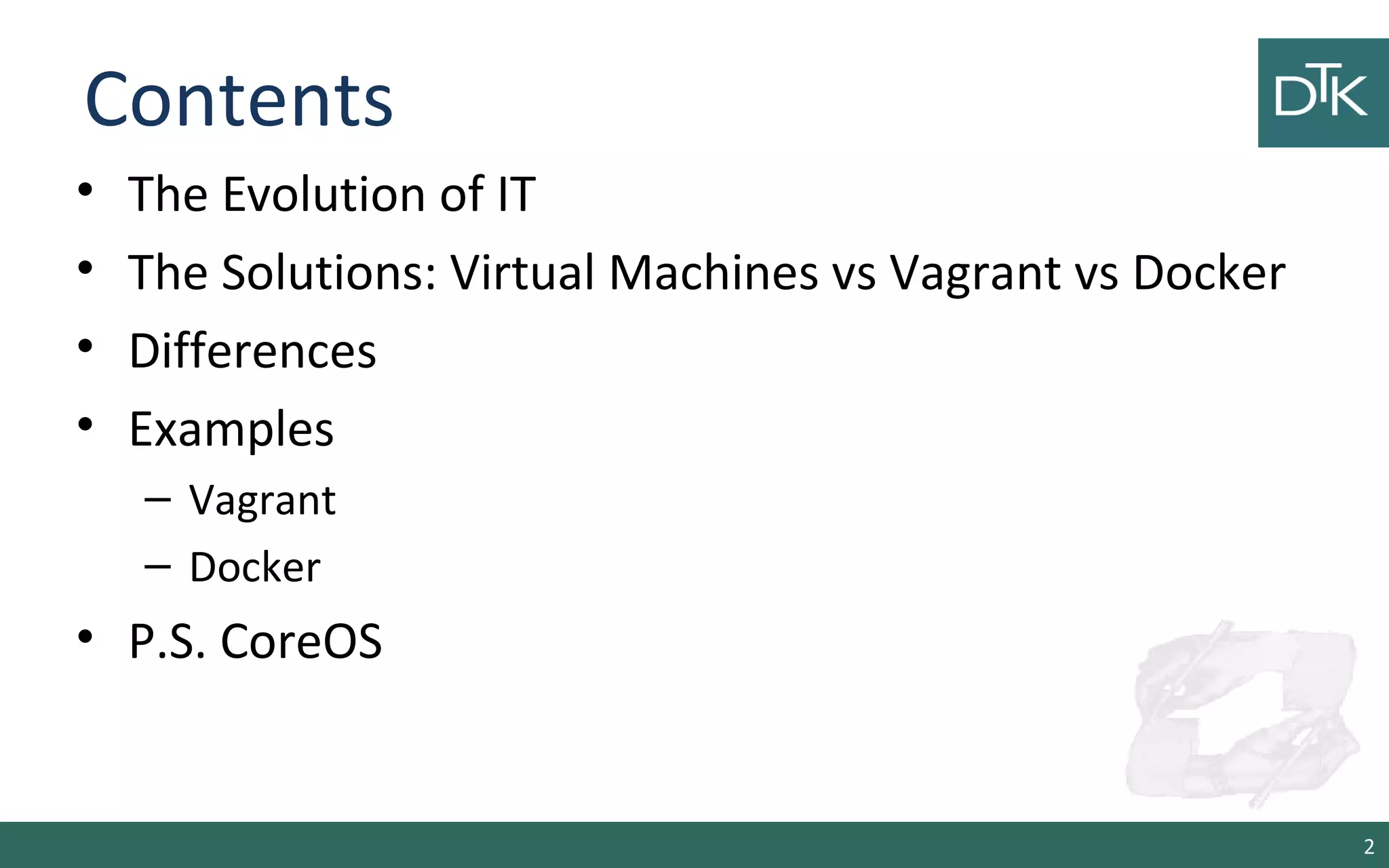 2) Virtual machines and their benefits of full isolation but large disk usage, and Vagrant which allows packaging and provisioning of VMs via files.