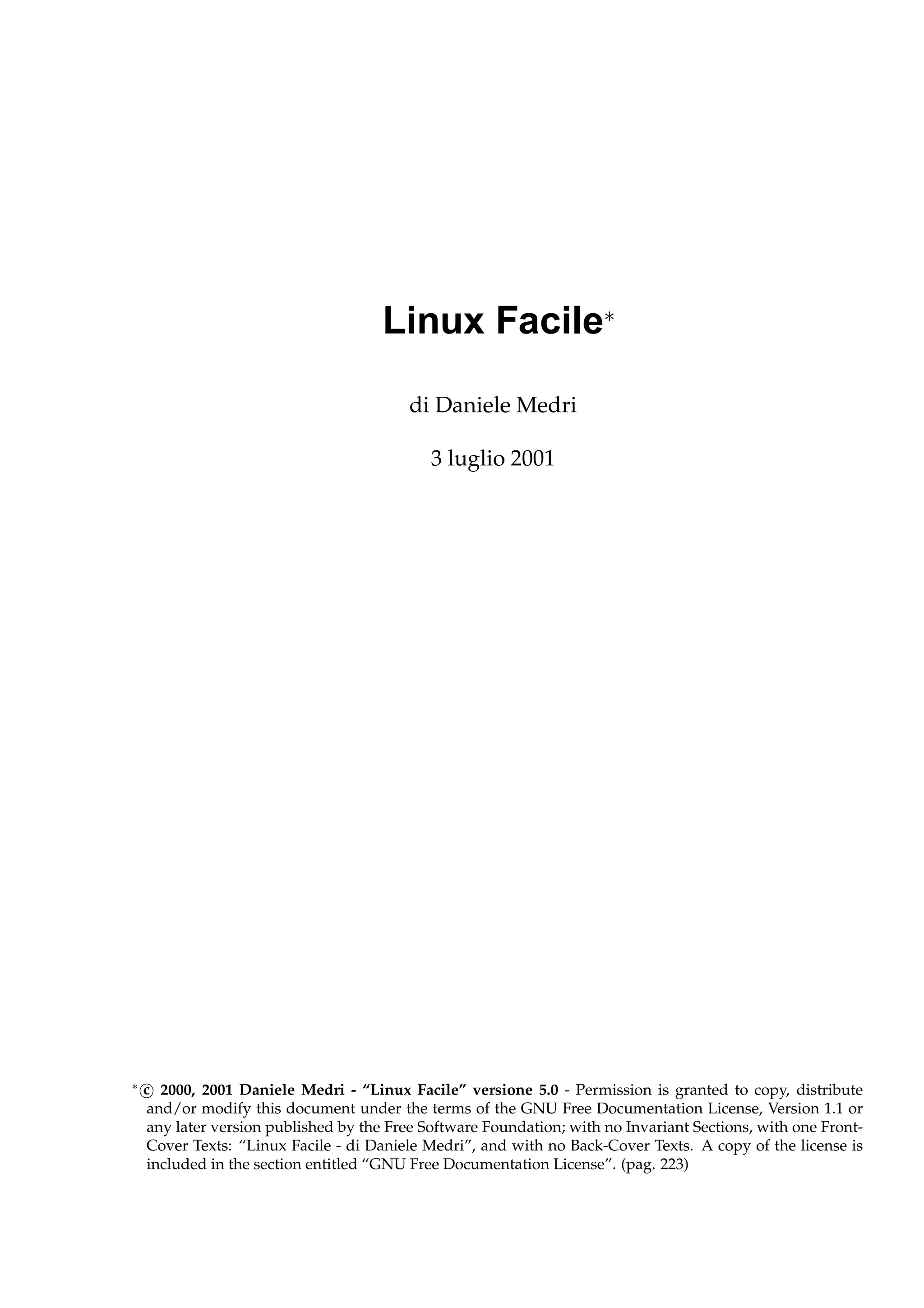 Il documento 'Linux Facile' di Daniele Medri offre un'introduzione al sistema operativo GNU/Linux, analizzando la sua storia, le caratteristiche e le applicazioni pratiche. Suddiviso in parti, il manuale affronta temi dall'installazione alla gestione dei sistemi, fino al networking, con un focus sulla sicurezza informatica. È un testo destinato sia a principianti che a utenti esperti, distribuito sotto la licenza GNU Free Documentation.