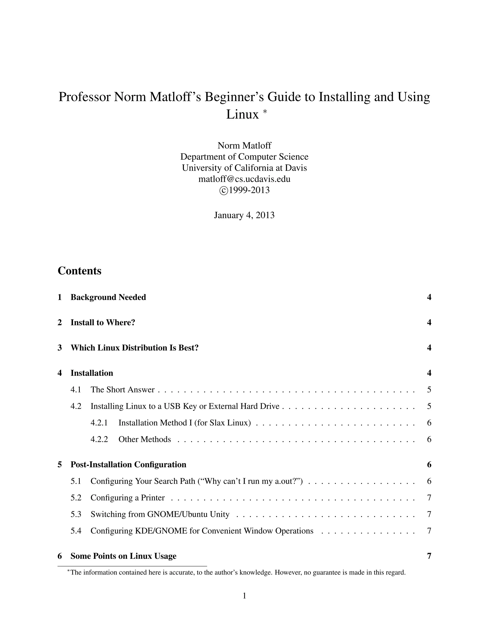 This document provides instructions for installing the Linux operating system on a computer. It recommends installing Ubuntu Linux and describes how to create a bootable Ubuntu USB drive using UNetbootin. This allows trying out Ubuntu without installing it permanently. The document then describes how to install Ubuntu permanently on the hard drive to dual boot with Windows. Additional topics covered include installing Linux on a USB drive or external hard drive, post-installation configuration, using Linux applications, and some advanced usage topics. The overall document provides beginner-friendly guidance for getting started with Linux.