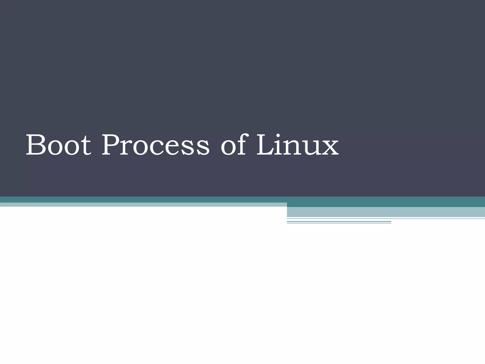 The document discusses the boot process of Linux operating systems. When a computer with Linux is turned on, the boot code in ROM loads and starts the kernel. The kernel then probes the system hardware and spawns the system init process. The Linux system can boot automatically or manually. In automatic mode, the complete boot procedure occurs without input, while manual mode involves operator intervention at a certain point before initialization scripts run. The typical Linux boot process involves loading and initializing the kernel, detecting and configuring devices, creating kernel threads, optional operator intervention, running system startup scripts, and achieving multiuser operation.
