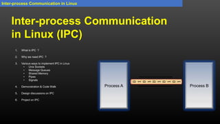 The document provides an overview of inter-process communication (IPC) in Linux, detailing its importance and various implementation methods such as UNIX sockets, message queues, shared memory, pipes, and signals. It explains the structure of processes, types of communication (stream vs. datagram), and the socket programming process, including client-server interaction via sockets. Additionally, it outlines a project example for synchronization of a routing table manager across clients using UNIX domain sockets.