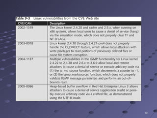 The document discusses vulnerabilities in the Linux operating system and countermeasures to protect Linux systems from remote attacks. It describes how attackers can use tools like Nessus to discover vulnerabilities, deploy trojan programs, and create buffer overflows. It also provides recommendations for system administrators, including keeping systems updated with the latest patches, using rootkit detectors, and training users to avoid social engineering attacks.