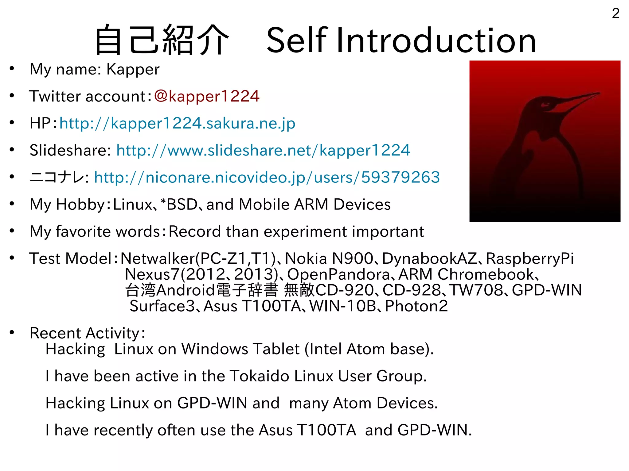 3.Linux distributions on Android 4. Plesentations in Asia(Singapore,Taiwan)