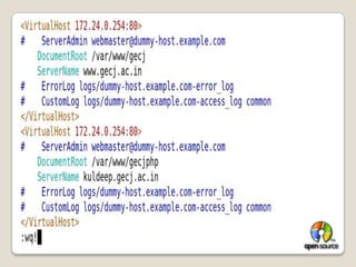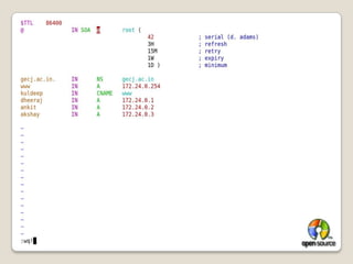 This document discusses software installation and configuration of Linux services including RPM packages, YUM, DNS server, and Apache web server. It provides instructions on installing software using RPM and YUM, configuring BIND as a DNS server, and setting up an Apache web server. Key steps include installing software, editing configuration files, starting and enabling services, and testing the DNS lookups and web pages.