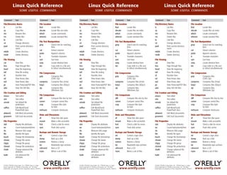 The document provides a quick reference for some useful Linux commands organized into categories including file/directory basics, file viewing, file creation and editing, file properties, file location, file text manipulation, file compression, file comparison, disks and filesystems, and backups and remote storage. It lists common commands such as ls to list files, cp to copy files, grep to search text, gzip to compress files, and df to show free disk space.