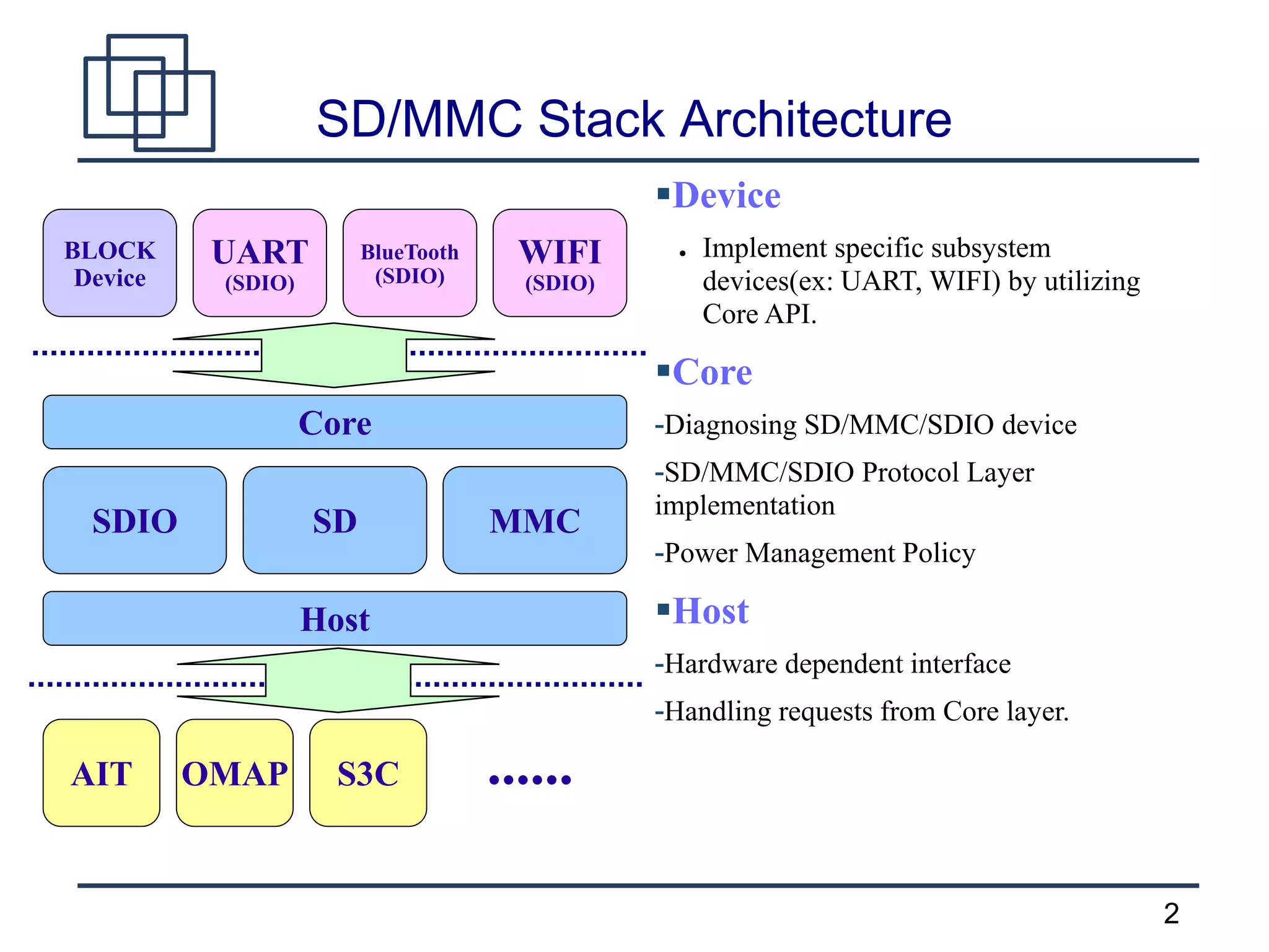 The document outlines the architecture and operational structure of the Linux SD/MMC driver stack, including the roles of core, device, and host components. It details the structure and allocation of the mmc_host, operations for managing requests, and data transmission handling. Additionally, it includes function definitions for host operations and request management within the SD/MMC framework.