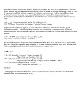 Clinton Speas has over 30 years of experience in software support, Linux/UNIX administration, and technical customer service. He has strong skills in C, PERL, shell scripting, and problem troubleshooting. Most recently he worked as a Software Engineer at Stratus Computer, where he performed functional testing, upgrades, and hardware/network configurations. He is motivated to ensure customer satisfaction and has a track record of collaborating well with development and support teams.
