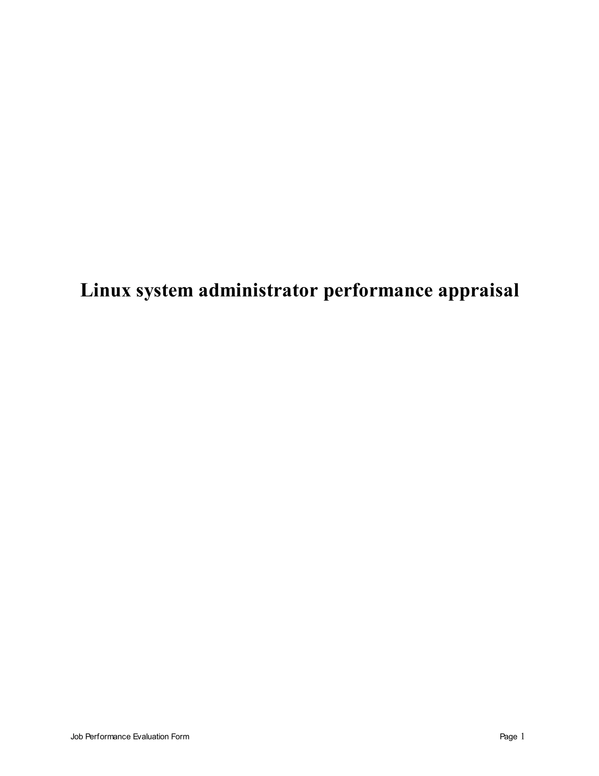 This document provides information and resources for evaluating the performance of a Linux system administrator. It includes sample evaluation forms, performance review phrases, and descriptions of common performance appraisal methods. Specifically, it discusses 12 different performance appraisal methods including management by objectives, critical incident method, behaviorally anchored rating scales, behavioral observation scales, 360 degree feedback, and checklist methods. The forms and phrases can be used to structure performance evaluations and provide constructive feedback. The discussion of appraisal methods provides guidance on different approaches to assessing an employee's work.