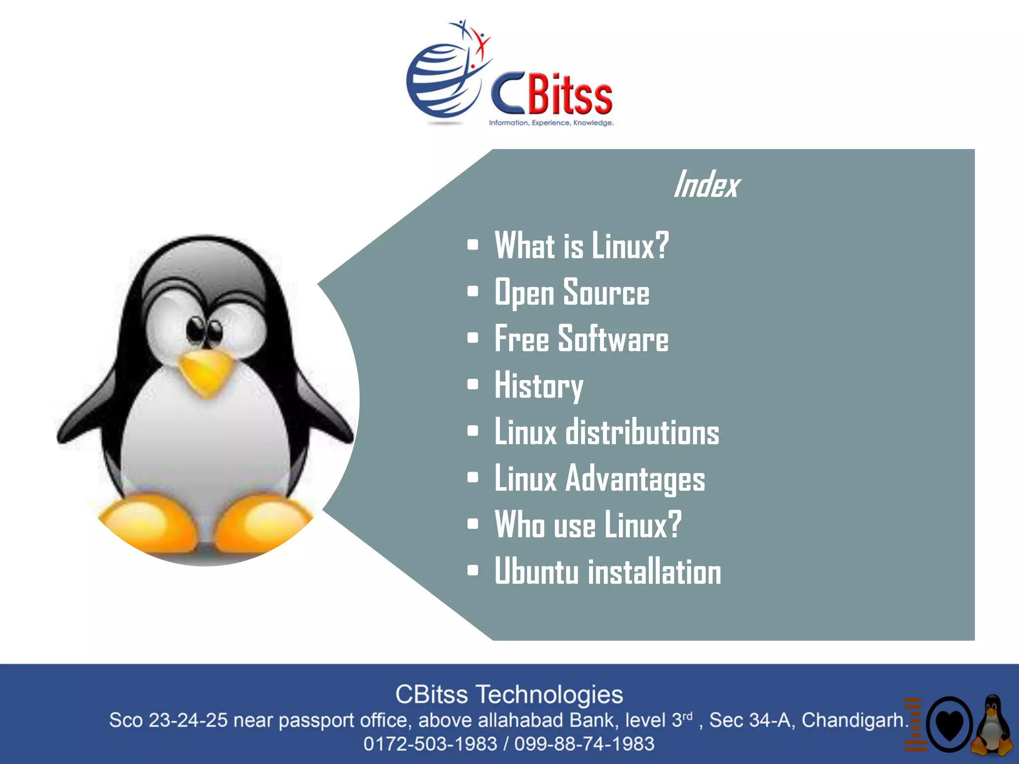 This document provides an overview of Linux including what it is, its history as an open source operating system, common Linux distributions, and its advantages over other operating systems. Linux was developed in the 1970s as a free Unix-like operating system and became widely popular for its stability, security, and ability to run on older hardware. It gives users freedom and control over the source code. Major Linux distributions include Ubuntu, Debian, and Red Hat Enterprise Linux. The document concludes by providing contact information for a Linux training institute that can provide certification courses.
