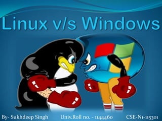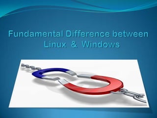 This document compares Linux and Windows operating systems. It discusses their origins, differences in being open source versus proprietary, graphical user interfaces, available applications, hardware support, ease of use, distributors, pricing, and security considerations. While Linux is free and open source, Windows has a larger user base and more available software. Both systems have advantages and continuing development will impact their future positions relative to one another.