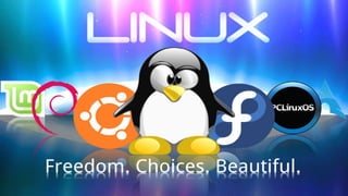 Linux is a free and open-source operating system created by Linus Torvalds in 1991. It began as an alternative to proprietary operating systems and can now run on a variety of devices from watches to supercomputers. Linux distributions package the Linux kernel with other free software to create complete operating systems. Popular distributions include Debian, Red Hat, and Slackware. The Linux community continues to enhance and support the operating system through collaboration.