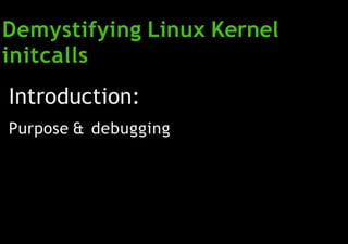 This document provides an overview of initcalls in the Linux kernel. Initcalls allow functions to be called at different stages during the boot process. They have been implemented since kernel version 2.4 and define helpers like pure_initcall and core_initcall to specify the initcall level. Over 2,000 initcalls exist across different levels. Debugging support was added later through initcall_debug and ftrace. Initcalls are implemented using object file sections that define entries in order of the Makefile components. This ordering determines the execution sequence of initcalls at each level.