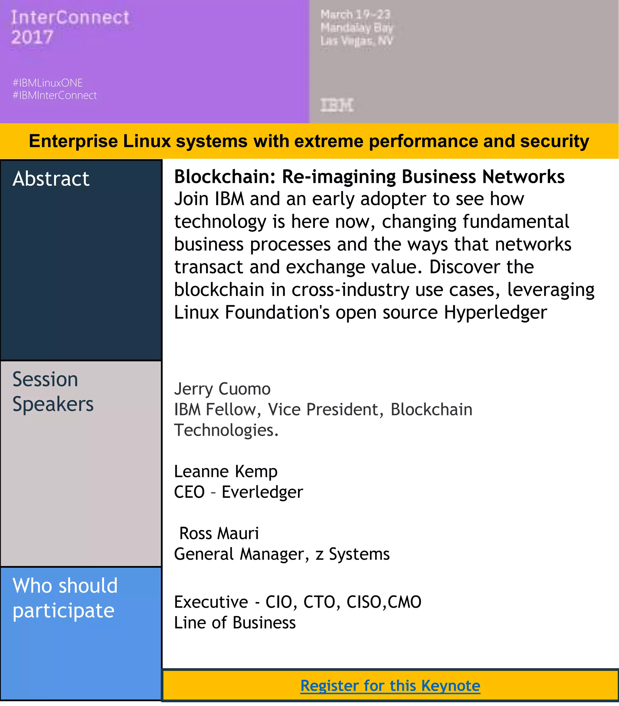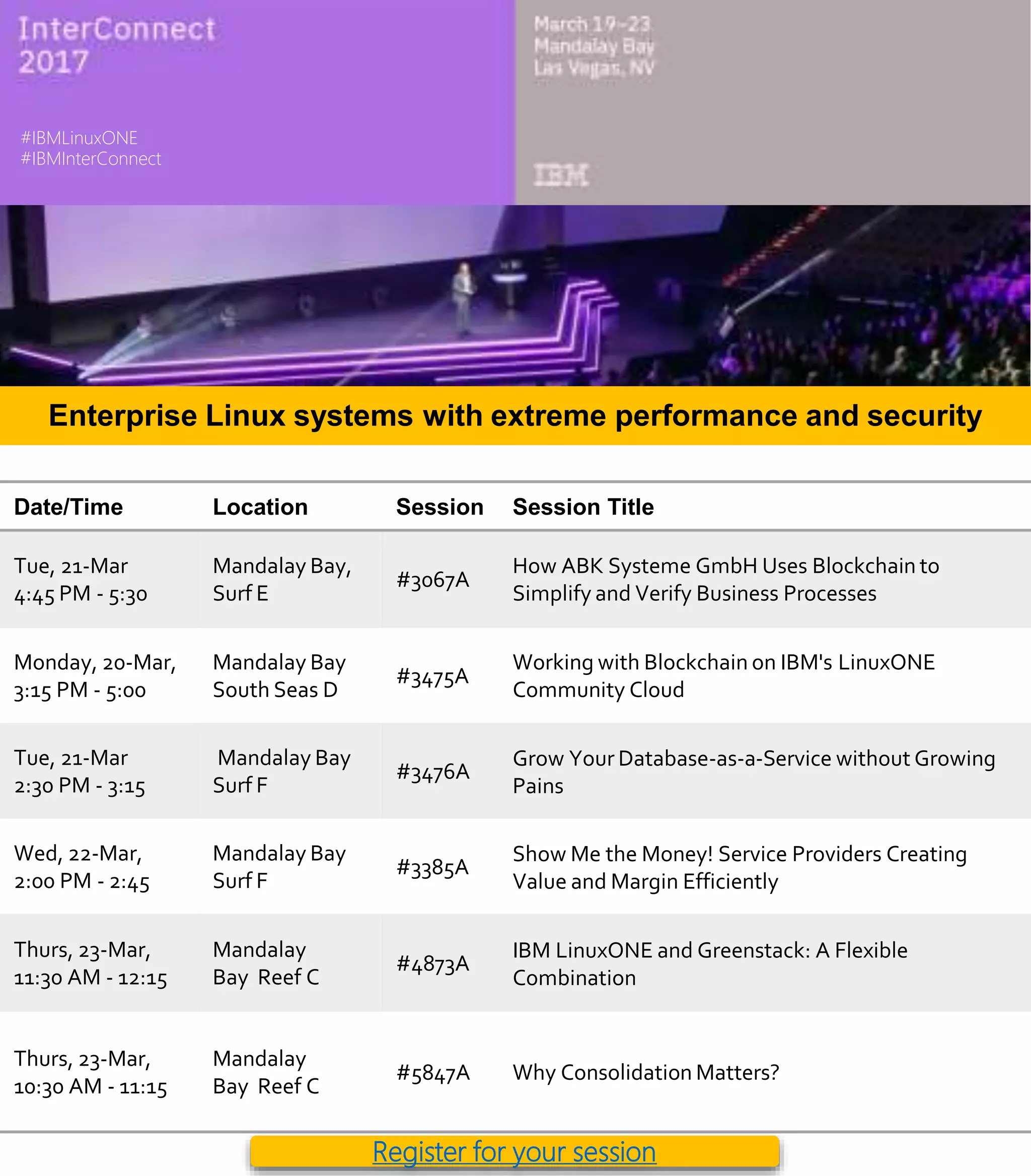 The document outlines a series of sessions scheduled at an upcoming conference, focusing on blockchain technology, enterprise Linux systems, and database growth strategies. Notable speakers include Jerry Cuomo from IBM and Leanne Kemp from Everledger, who will discuss the implementation and impact of blockchain across industries. Additionally, there are sessions aimed at addressing client needs in managed services and improving performance through workload consolidation.