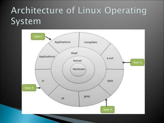 The Unix operating system was developed in 1969 by Ken Thompson, Dennis Ritchie, Douglas McIlroy, and Joe Ossanna at Bell Labs. It uses a kernel to manage hardware interactions and processes, memory, file systems, and device access. The shell interprets commands from users and passes them to the kernel. There are various shells like C Shell, Bourne Shell, and Korn Shell. Unix organizes all data into files within a hierarchical directory structure.