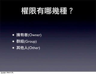 • chown littleq aicp0529](https://image.slidesharecdn.com/linux-100821132305-phpapp01/85/Linux-Permission-8-320.jpg)
