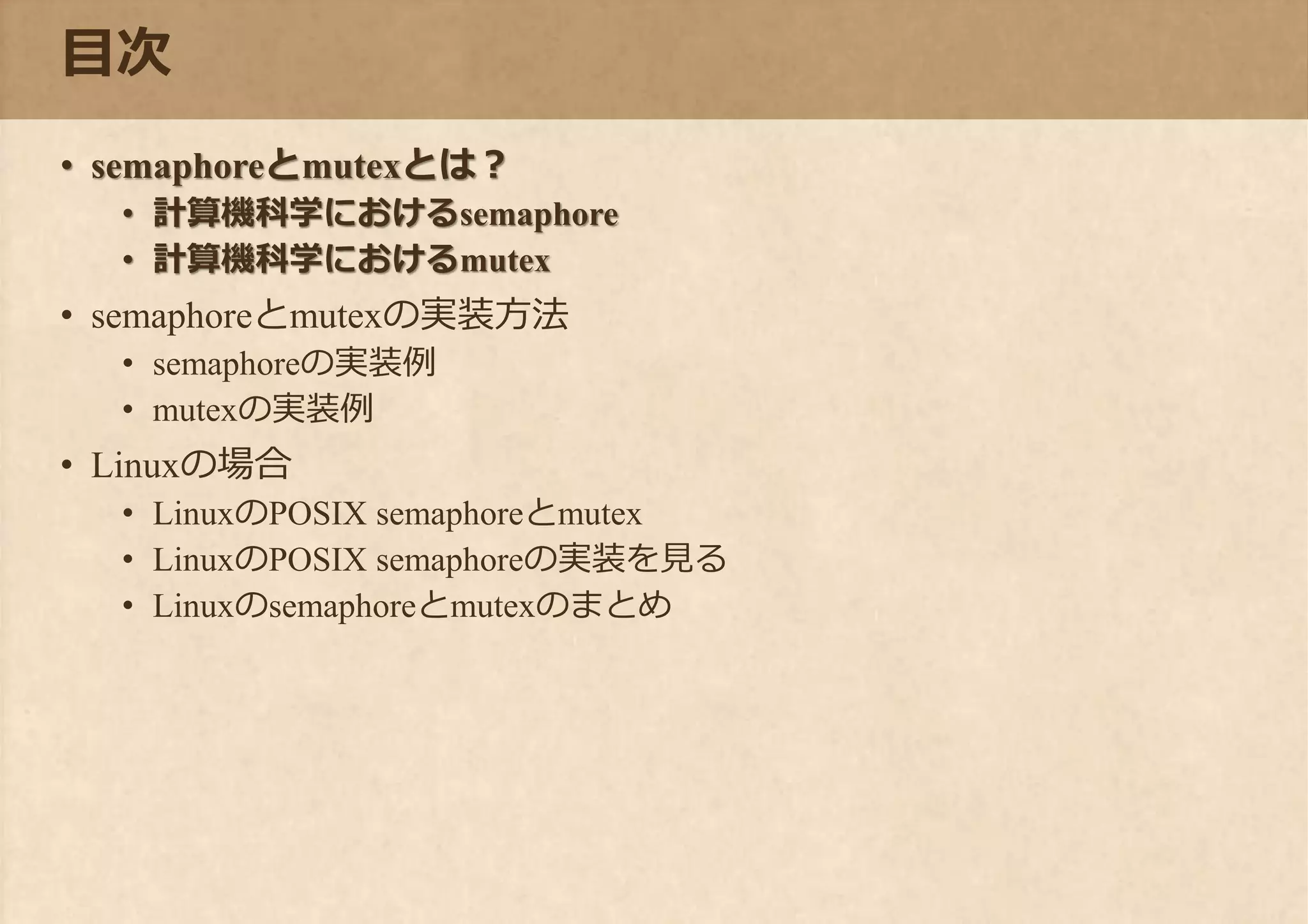 計算機科学におけるmutex • semaphoreとmutexの実装方法 • semaphoreの実装例 • mutexの実装例 • Linuxの場合 • LinuxのPOSIX semaphoreとmutex • LinuxのPOSIX semaphoreの実装を見る • Linuxのsemaphoreとmutexのまとめ