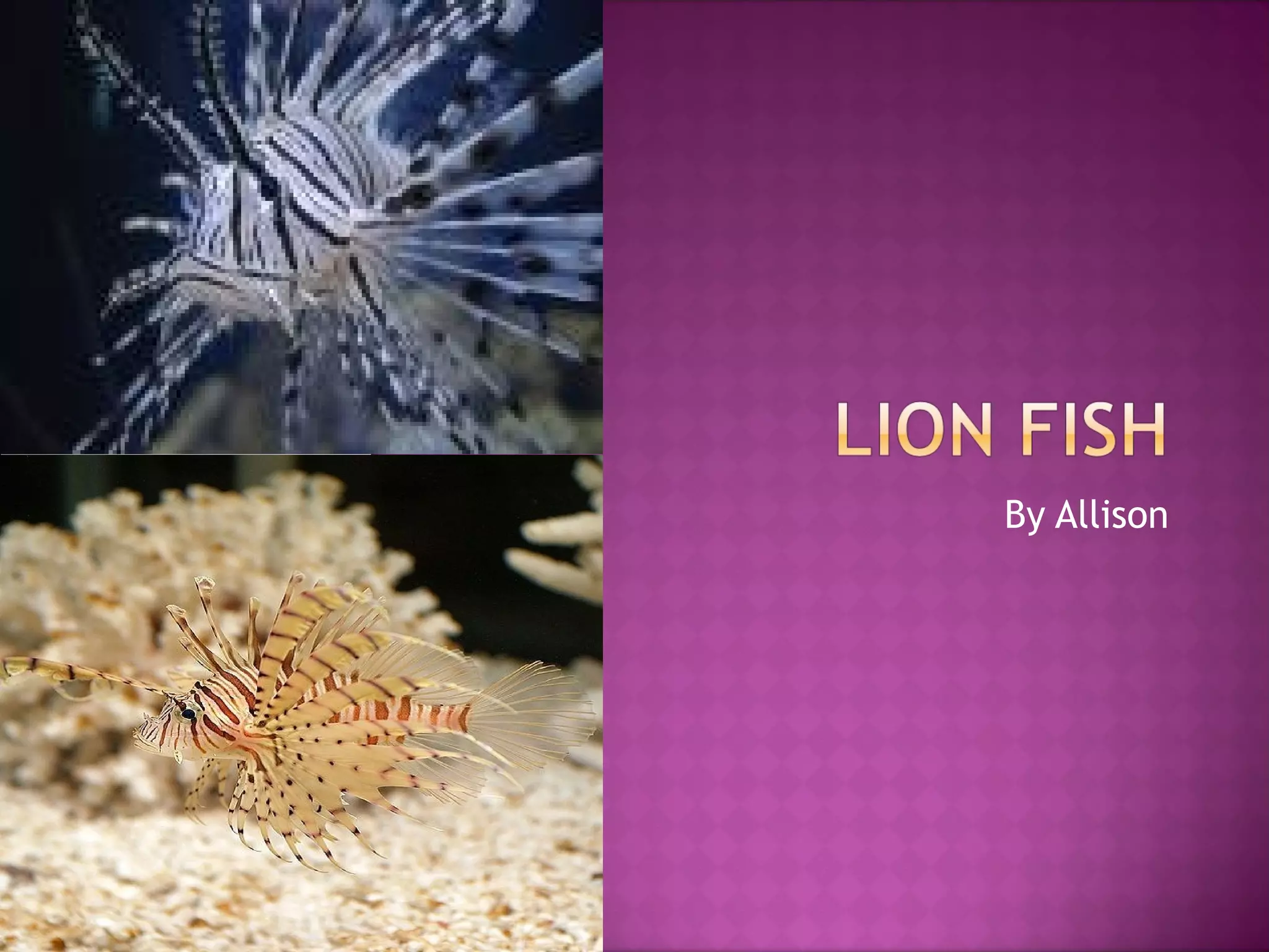 The Lionfish is a colorful fish that can grow up to 15 inches long, has venomous spines that can paralyze or kill its prey like small fish and shrimp, and lives in coral reefs in the Pacific and Indian Oceans. It relies on camouflage and fast reflexes to hunt, and its stripes warn predators that it is poisonous, though humans, eels and frogfish prey on lionfish.
