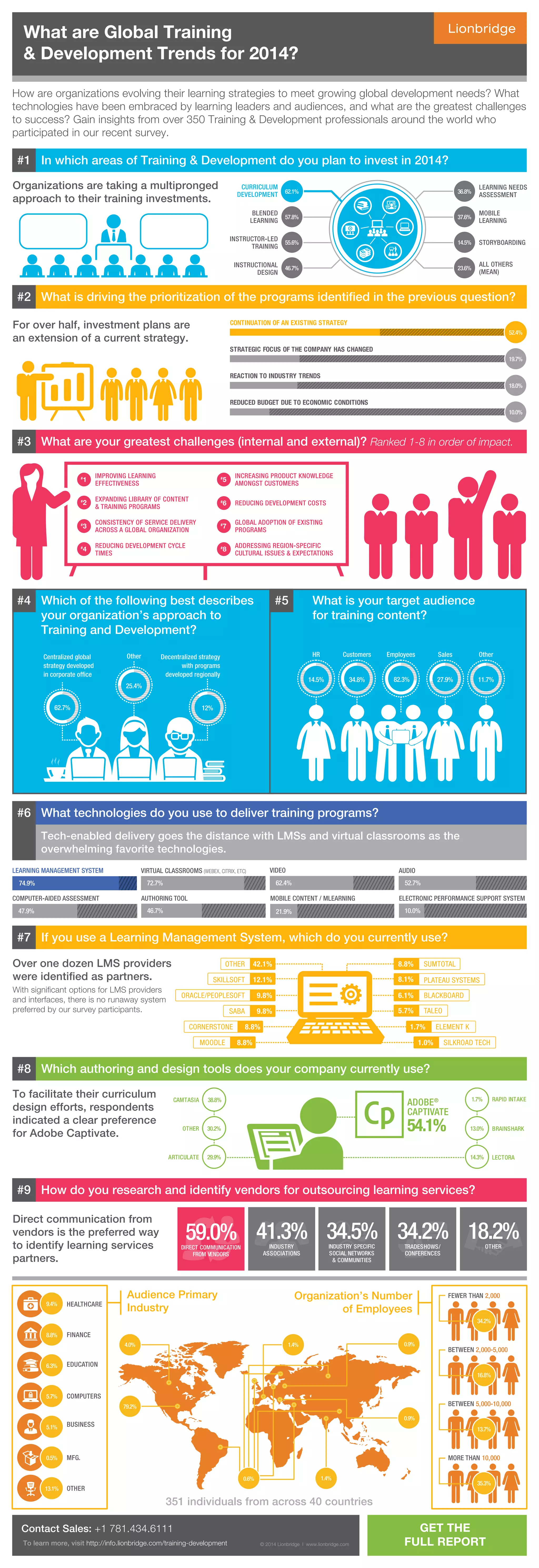 Organizations are taking a multipronged approach to training investments, with over half continuing an existing strategy. The top challenges for training are improving learning effectiveness, expanding content libraries, and ensuring consistent service globally. Technologies like learning management systems, virtual classrooms, video and audio are most used for delivery. Adobe Captivate is preferred for curriculum design.
