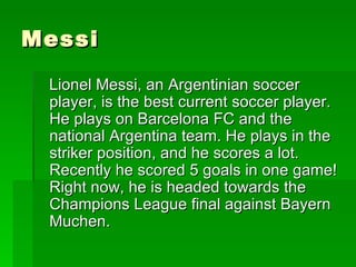 Lionel Messi is considered the best soccer player currently playing. The Argentinian striker plays for Barcelona FC and Argentina's national team, and is known for scoring many goals, including 5 in one game recently. Some key facts about Messi are that he was born in Rosario, Argentina in 1987, has won 5 La Liga titles and 3 Champions League titles, and wears the number 10 jersey.