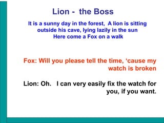 The lion claims that he can fix a broken watch and TV, even though the fox and wolf doubt his ability due to his large claws. Both bring their broken items to the lion. He disappears into his cave and returns with the items working perfectly. It is revealed that the lion has a team of small but intelligent rabbits in his cave that do the actual repair work, allowing the lion to take credit while he lies in the sun pleased with the results.