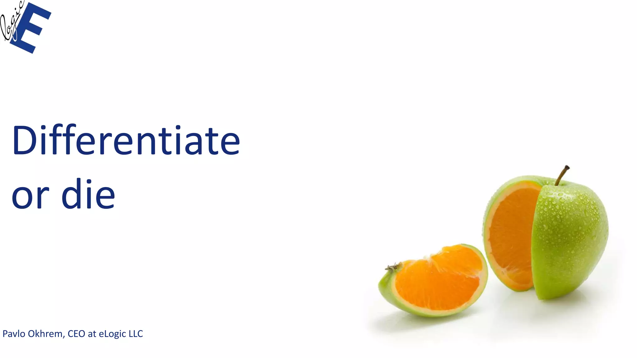 The document is a presentation by Pavlo Okhrem, CEO of Elogic LLC, focusing on the importance of differentiation in business strategy, particularly in the IT sector. It outlines various strategies for achieving differentiation, such as focusing on specific niches, adding value through expertise, and achieving recognition through awards and certifications. The conclusion emphasizes the necessity of having a strategic business plan and the mantra to 'differentiate or die'.