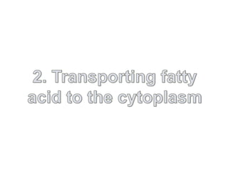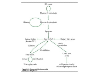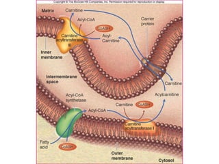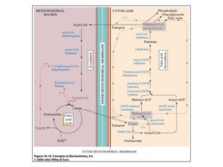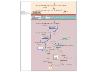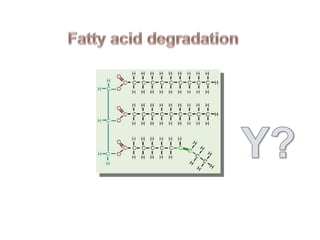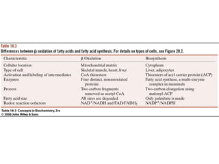 3. Fatty acid degradation and biosynthesis are compared. β-oxidation in the mitochondria degrades fatty acids in four steps to generate acetyl-CoA for the citric acid cycle, while fatty acid synthesis in the cytoplasm builds fatty acids like palmitate from acetyl-CoA and malonyl-ACP.