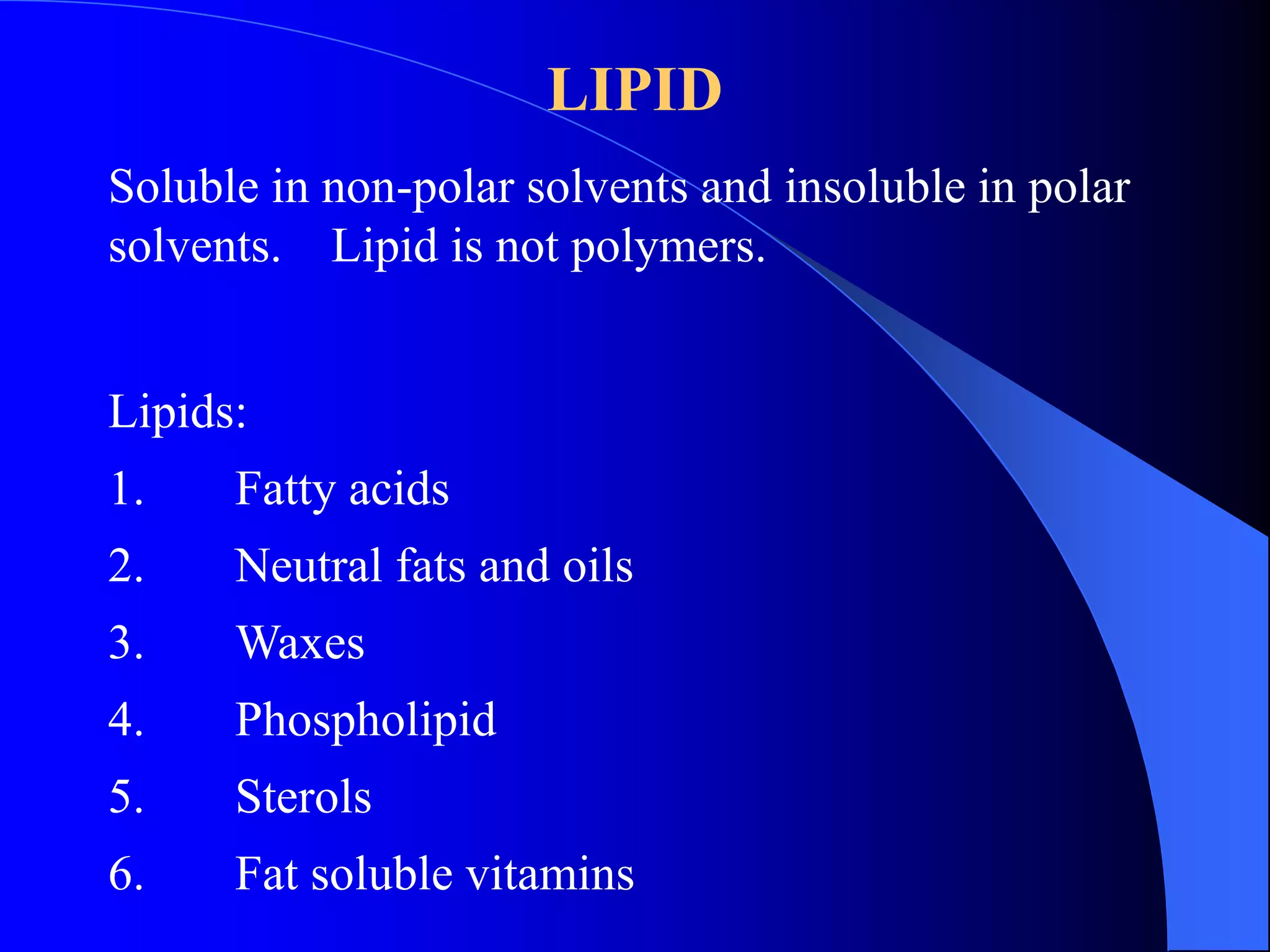 This document summarizes the key characteristics and types of lipids. Lipids are insoluble in water but soluble in non-polar solvents. The main types of lipids discussed include fatty acids, neutral fats and oils, waxes, phospholipids, sterols, and fat-soluble vitamins. Specific lipids like triglycerides, cholesterol, and various fatty acids are examined in detail. Analytical methods for analyzing lipids, such as acid value, saponification value, iodine number, gas chromatography, and enzymatic assays are also outlined.