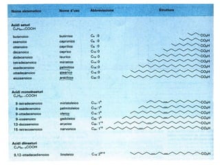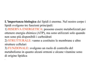 I lipidi sono sostanze biologicamente attive, insolubili in acqua e fondamentali per il metabolismo umano, fungendo da riserva energetica, costituenti strutturali e regolatori funzionali. Si suddividono in lipidi saponificabili e insaponificabili, con i primi che includono trigliceridi e fosfolipidi, e i secondi comprendenti steroidi e vitamine liposolubili. I lipidi giocano un ruolo cruciale nella formazione delle membrane cellulari e nella regolazione di processi biologici attraverso ormoni e reazioni cellulari.