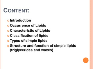 The document discusses lipids, detailing their characteristics, occurrence, classification, and types such as triglycerides and waxes. Lipids are described as hydrophobic compounds that function as energy sources, signaling molecules, and membrane components in both plants and animals. The document also covers the structural differences between saturated and unsaturated fatty acids and the roles of triglycerides and waxes in biological systems.