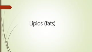 This document discusses lipids (fats) including their composition, classification, functions, sources, and deficiencies. Lipids are comprised of carbon, hydrogen, and oxygen and provide 9 calories per gram. They are classified as simple lipids, compound lipids, waxes, and derived lipids. The main lipids in diet are triglycerides, phospholipids, and sterols. Triglycerides make up 95% of dietary and body lipids and are broken down into glycerol and fatty acids. Phospholipids are important structures in membranes. Sterols are precursors to bile acids and sex hormones. Fats have many important functions like being an energy source and aiding vitamin absorption. Deficiencies can cause skin disorders like