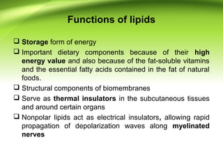 The lipids are a heterogeneous group of compounds that include fats, oils, steroids, waxes, and related compounds. They share the properties of being relatively insoluble in water but soluble in nonpolar solvents. Lipids serve important functions such as energy storage, structural components of cell membranes, and insulation. They can also be classified based on their structure into simple lipids like triglycerides and complex lipids like phospholipids and glycolipids. Phospholipids and glycolipids are amphipathic molecules that form lipid bilayers, which are the basic structure of biological membranes.
