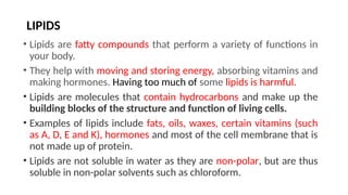 The document discusses lipids, their properties, and classifications such as simple, complex, derived, and miscellaneous lipids, explaining their roles in energy storage, cell structure, and signaling. It details fatty acids along with their classifications based on chain length and degree of unsaturation, highlighting their physical and chemical properties. The document also covers important functions of lipids in biological processes and their significance in health.