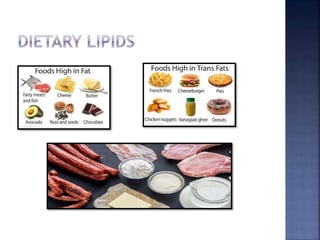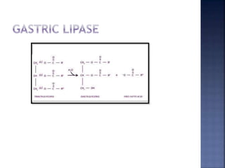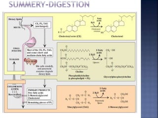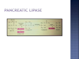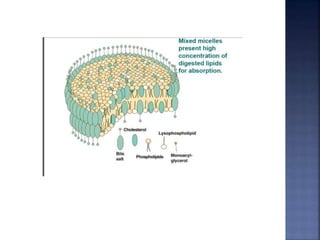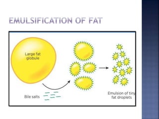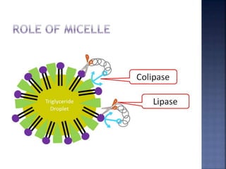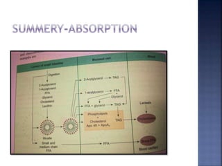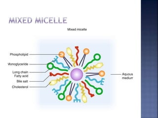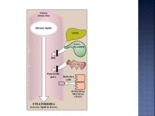 This document summarizes fat digestion and absorption. It notes that most dietary fat consists of triglycerides which are broken down into fatty acids and glycerol by lingual lipase in the mouth, gastric lipase in the stomach, and pancreatic lipase in the small intestine. Bile salts are also required to emulsify fat into micelles to allow absorption. The fatty acids and glycerol are reassembled into triglycerides and incorporated into lipoproteins for transport through the lymphatic system and blood. Disorders that can interfere with fat digestion or absorption include pancreatic problems causing steatorrhea, gallstones obstructing bile flow, and intestinal diseases impairing absorption.