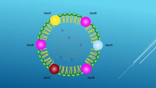 This document defines and classifies different types of lipoproteins. It discusses lipoproteins' roles in transporting lipids like triglycerides and cholesterol through the bloodstream. The main lipoproteins described are chylomicrons, VLDL, IDL, LDL, and HDL. Chylomicrons and VLDL transport lipids from the intestine and liver to tissues. Their triglycerides are broken down by lipoprotein lipase, forming chylomicron/VLDL remnants taken up by the liver. LDL transports cholesterol to tissues, while HDL transports excess cholesterol from tissues back to the liver in reverse transport.