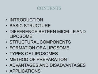 This document summarizes a seminar on liposomes presented by Venkatesh Goli. It defines liposomes as spherical vesicles composed of phospholipid bilayers that were first described by Dr. Bangham in 1960. The summary explains that liposomes are composed of phospholipids and cholesterol and can be unilamellar or multilamellar depending on the number of bilayers. Various preparation methods are outlined including mechanical dispersion, solvent dispersion, and detergent removal. The advantages of liposomes include increased drug efficacy, stability, and reduced toxicity while disadvantages include low water solubility and high production costs. Finally, applications of liposomes are described for drug delivery, cosmetics, and cancer therapy.