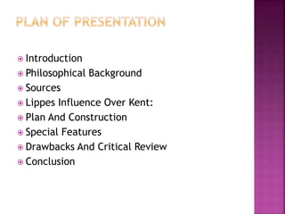 Constantine Lippe's repertory was an early foundational work that influenced Kent's repertory. It followed Hahnemann's schema of generals to particulars. While not entirely uniform, it arranged symptoms alphabetically within categories of location, sensation, sides, extension/radiation and modality. This pioneering repertory established guidelines for systematic repertorization despite some inconsistencies in construction between sections. It provided a base for the development of more advanced repertories like Kent's.