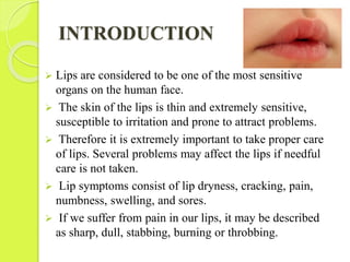 The document discusses the anatomy and care of lips and eyelids, highlighting their sensitivity and the importance of proper cosmetic use to prevent issues such as dryness or irritation. It details common lip problems, various types of lip makeup products, and formulations for different cosmetics, including lipsticks and eye shadows. The document also emphasizes the need for safe and non-irritating materials in eye makeup products due to the sensitivity of the eye area.