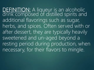 Liqueurs are sweetened, flavored spirits made by infusing or distilling herbs, fruits, seeds or nuts into alcohol. They are typically lower in alcohol than other spirits. The document defines liqueurs and describes their key constituents and production process. It provides examples of different types of liqueurs including fruit, cream, herb and botanical mixtures. Popular liqueurs discussed include Benedictine, Drambuie, Galliano and Sambuca.