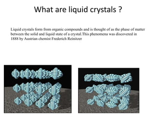 Liquid crystals are a state of matter between solid and liquid that form from organic compounds. They were discovered in 1888 by Austrian chemist Frederich Reinitzer. Liquid crystals exhibit ordered phases above melting points and have properties between solids and liquids. There are different types of liquid crystal phases including nematic, smectic, and blue phases that have distinct textures and properties. Liquid crystals find uses in devices like flat screen displays, watches, and thermometers.