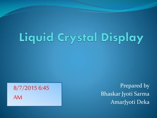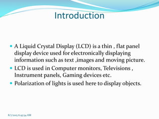 LCDs use liquid crystals and polarized light to display images on a thin, flat screen. They have advantages over older CRT displays like smaller size, lower power consumption, and lighter weight. LCD pixels use liquid crystals that can be aligned by electric fields to allow light to pass through polarized filters, turning pixels on and off. Active matrix LCDs provide higher resolution by adding a transistor to each sub-pixel for individual control.